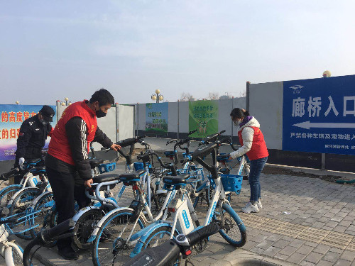 志愿者協助保安對廊橋引橋主口、西口的共享單車進行規范擺放