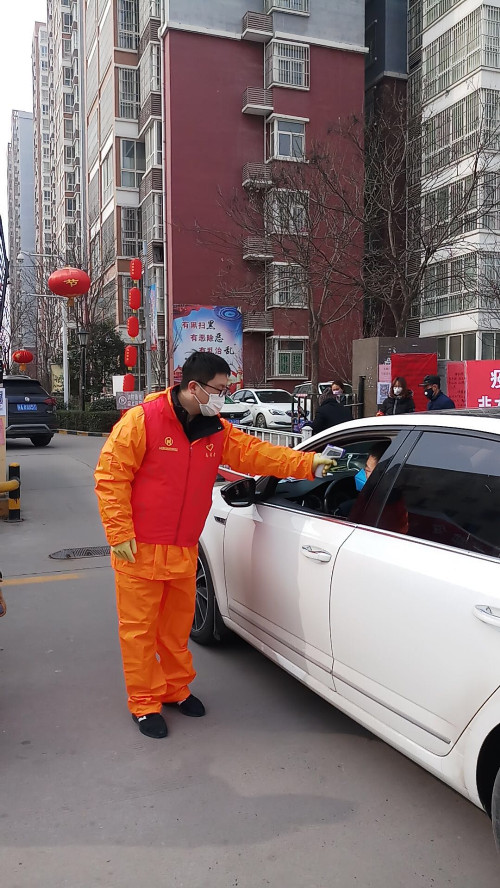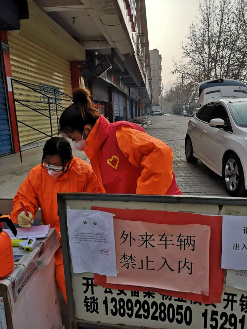 志愿者協助小區做好出入口人員測溫、信息登記工作